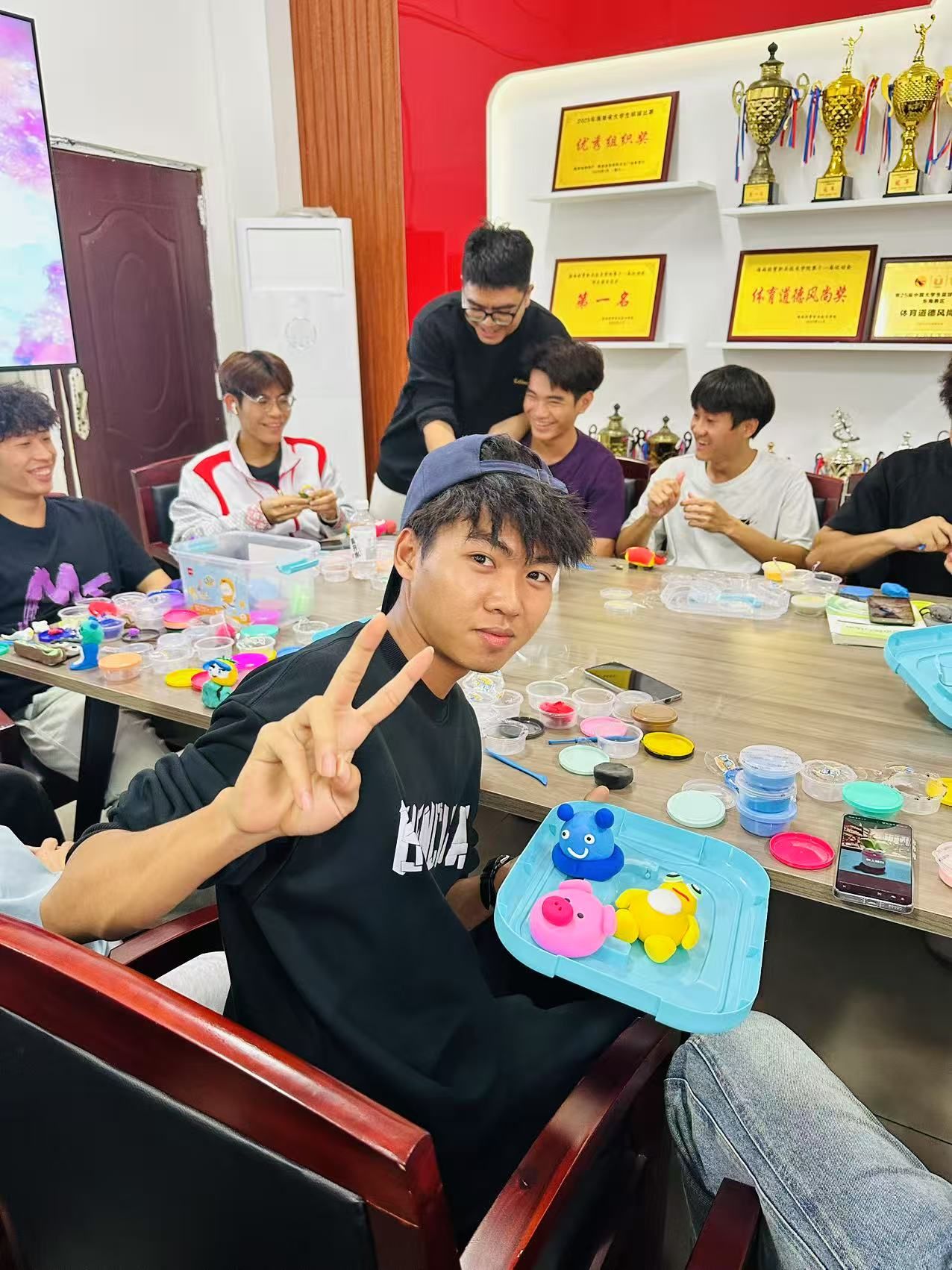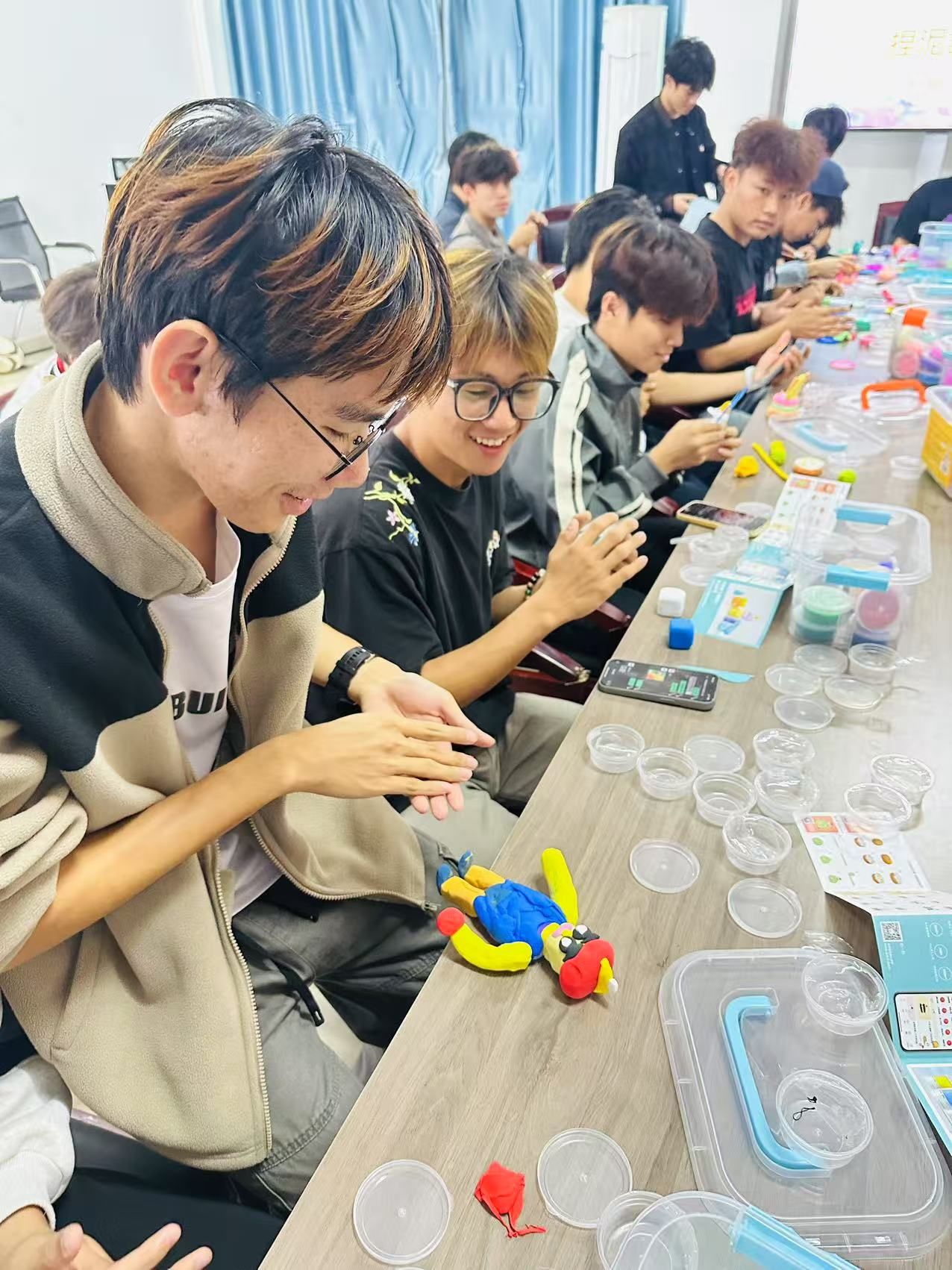 活动在轻松愉快的氛围中拉开序幕。现场准备了多种彩泥以及制作工具,在主持人的引导下,同学们逐步投入到捏塑创作中。活动中,大家专注构思、用心揉捏,将内心的情绪与想象转化为一个个独具个性的泥塑作品。有的同学捏出了生动可爱的小动物,有的创作出象征希望与宁静的植物与风景,现场气氛温馨而专注。